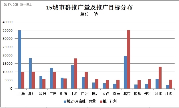 截至2015年9月,39個(gè)新能源汽車推廣應(yīng)用城市(區(qū)域)累計(jì)推廣應(yīng)用新能源汽車總量達(dá)到180945輛,較上月增長(zhǎng)13.4%。其中,較之8月,新增完成推廣目標(biāo)的城市(群)僅有廣東城市群,完成推廣量12377輛,超過(guò)推廣目標(biāo)5千輛之多,僅9月推廣量就達(dá)5327輛。