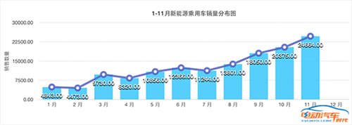 根據(jù)乘聯(lián)會最新的數(shù)據(jù)統(tǒng)計,11月份的新能源乘用車銷量再創(chuàng)新高,繼10月份銷量突破2萬輛后繼續(xù)保持高速增長,本月達到了24664輛。相比于上一月增長了4289輛是在今年的單月增長銷量中暫排第二,目前單月增長銷量最高的是今年3月份達到的5257輛,但那是在二月份只有4千多輛的銷量基礎上實現(xiàn)的。
