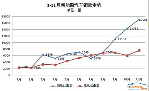 其中純電動車型銷售17065輛,同比增長231%;插電混動車型銷售7599輛,同比增長262%。從銷量數(shù)據(jù)來看,純電動車型的銷量是插電混動車型銷量的2倍多。其實縱觀全年的銷量紀錄不難發(fā)現(xiàn),純電動車型的銷量幾乎一直領先于插電式車型,并且這種優(yōu)勢在8月份以后變的非常明顯。會產(chǎn)生這種現(xiàn)象筆者認為主要有兩點原因,一方面是因為銷售純電動車型的廠商較多所以車型也相對多一些,比如眾泰云100、北汽的E系列、騰勢、晨風等等車型給消費者的選擇空間較大。另一方面原因是因為插電混動車型的售價普遍較高,像比亞迪唐、榮威550、沃爾沃S60L插混等車型。售價大多集中在20萬元以上的區(qū)間,較高的售價難免會對銷量造成一些影響。