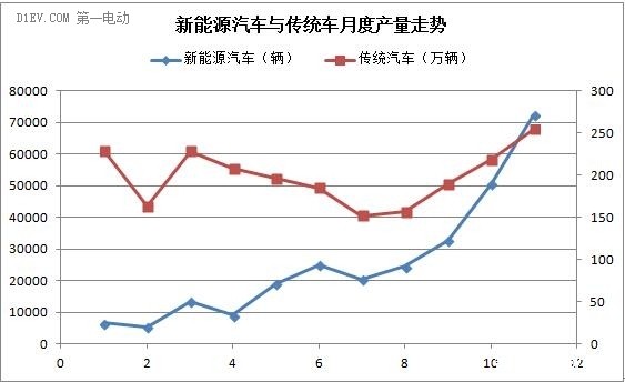 從月度產(chǎn)量走勢(shì)圖上可看出,今年前11月新能源汽車與傳統(tǒng)車產(chǎn)量走勢(shì)波動(dòng)近似,尤其是從7月開始,連續(xù)4個(gè)月實(shí)現(xiàn)不同幅度增長(zhǎng)。不同的是,雖然新能源汽車發(fā)展初期產(chǎn)量基數(shù)相對(duì)傳統(tǒng)車較少,但其增勢(shì)表現(xiàn)十分強(qiáng)勁。