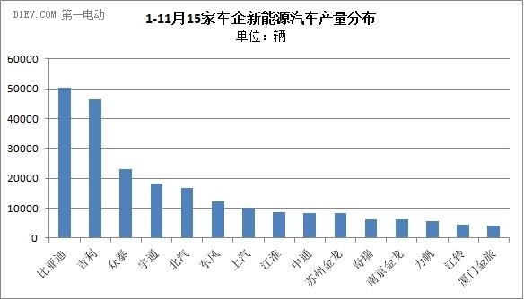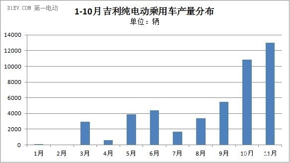 排在第二位的吉利產(chǎn)量累計(jì)達(dá)4.6萬輛,純電動(dòng)乘用車領(lǐng)域中,吉利一家獨(dú)大,從9月5千多輛躍升至10、11月連續(xù)兩月萬輛水平,兩月連續(xù)占據(jù)純電動(dòng)乘用車總產(chǎn)量的近50%。吉利旗下主力車型主要包括知豆系列、康迪車型。主打“微公交”領(lǐng)域的康迪電動(dòng)車,經(jīng)過2年多的發(fā)展,已在杭州投放超過16000多輛,延伸至上海、南京、武漢、成都、廣州、長(zhǎng)沙、昆明等10余座城市開展試運(yùn)行。