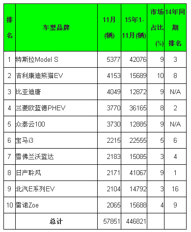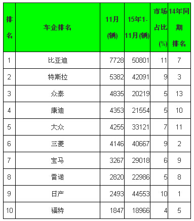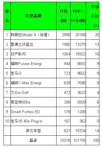 上圖是電動(dòng)汽車制造商各自旗下所有電動(dòng)車型的綜合銷量排名,比亞迪已經(jīng)連續(xù)第7個(gè)月摘得冠軍,11月旗下所有電動(dòng)車型的總銷量達(dá)到7728輛,再次創(chuàng)造新的記錄。2015年前11個(gè)月的累計(jì)銷量超越日產(chǎn)5000輛。2014年結(jié)束時(shí),比亞迪還排在第7,追趕速度很驚人。