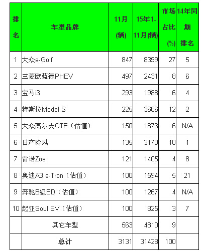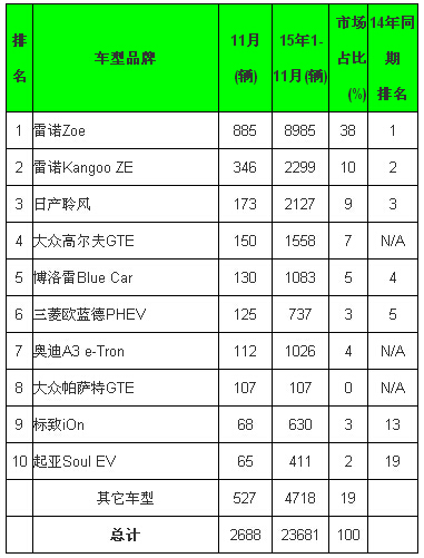 從今年前11個(gè)月的累計(jì)銷售情況看,主要的變化是雷諾Kangoo ZE返回到第二位,與日產(chǎn)聆風(fēng)調(diào)換位置。三菱歐藍(lán)德PHEV攀升至第7,標(biāo)致iOn上升一個(gè)位置至第9,雷諾TWIZY和起亞Soul EV現(xiàn)在分列第11和第13,雪鐵龍C-Zero上升一位到第16。
