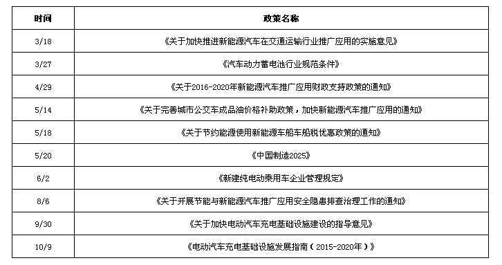 政策層面上,我國政府新能源汽車政策推出數(shù)量、頻率等方面達到了極高的水平。以2015年為例,國家共出臺10項重大政策,幾乎每月都有新政策出臺,從頂層設(shè)計、補貼、稅費減免、基礎(chǔ)設(shè)施等多個方面為新能源汽車產(chǎn)業(yè)保駕護航。