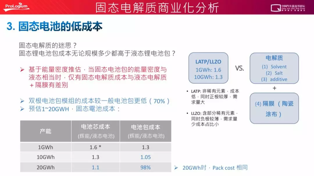 但是第二個問題,在體積能量密度狀況上,他的成組效率是53%,我們成組效率是70%—75%,這個時候我們就超過它了。得出的結(jié)論就是說,如果用雙極電池技術(shù)的狀況下,我們的能量密度,就算是采用相同的活性材料也能夠達到和現(xiàn)在(液態(tài)電池包)一樣的水平,唯一的問題點就是只有固態(tài)電解質(zhì)本身的價格。