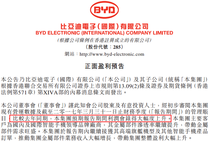 4月12日,比亞迪電子(00285)發(fā)布了第一季度正面盈利預(yù)告,預(yù)計第一季度盈利同比大幅上升。受此利好消息影響,比亞迪電子股價13日再創(chuàng)近兩年的新高。