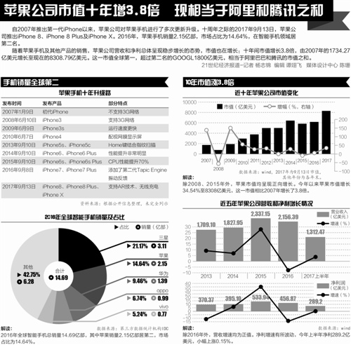 咨詢機構(gòu)弗若斯特沙利文大中華區(qū)總裁王昕在接受21世紀經(jīng)濟報道記者采訪時認為,新款iPhone回歸雙面玻璃機身、取消home鍵的全面屏設(shè)計,以及無線充電等重大的技術(shù)突破,刺激了消費者的購買欲望。“蘋果在硬件配置方面創(chuàng)新不足,小米、三星、vivo、努比亞等品牌已經(jīng)表示將發(fā)布全面屏手機;在人臉識別方面,三星今年初推出的S8就加入了人臉識別技術(shù)。”