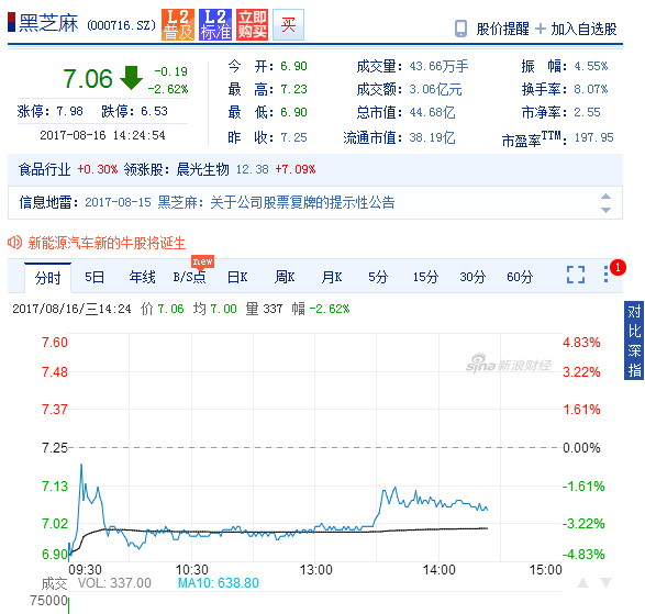 停牌8個多月的黑芝麻昨日復(fù)牌遭遇一字跌停。今日盤中再度大跌近4%。