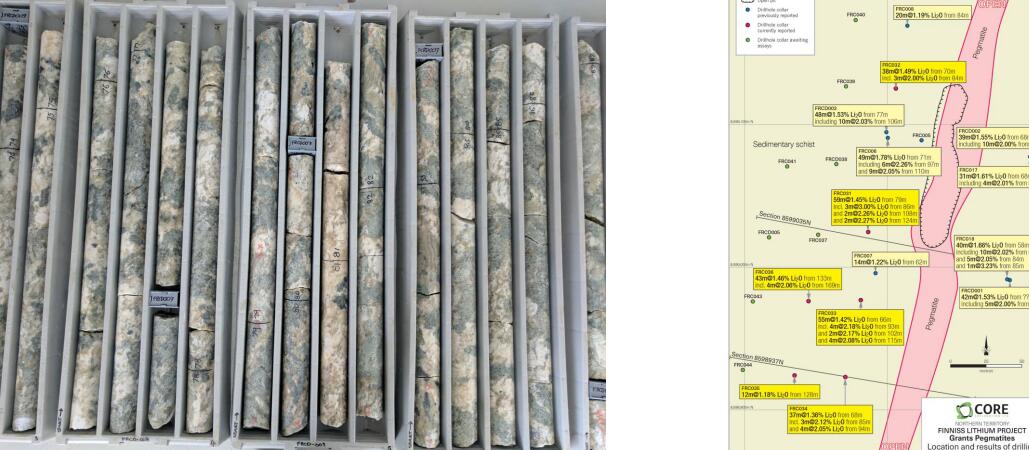 根據(jù)早前公告,核心地勘在北領(lǐng)地鋰項(xiàng)目區(qū)內(nèi)首次鉆井時(shí)發(fā)現(xiàn)一處70米長(zhǎng)的偉晶巖橫斷面,其中部突出的核心區(qū)域長(zhǎng)1000米,寬400米,且含有較高的鋰元素。而根據(jù)8月30日的最新公告,相關(guān)鉆探項(xiàng)目已正式啟動(dòng),用于探查新的偉晶巖花崗巖目標(biāo)區(qū)域,預(yù)計(jì)四周后可獲得相關(guān)鉆探分析結(jié)果。