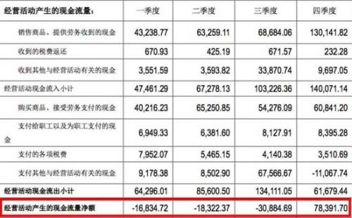 從江特電機對深交所2016年年報問詢函的回復中,同樣可以清楚地看到,公司2016年一季度至三季度,經(jīng)營活動產(chǎn)生的現(xiàn)金流全部為負數(shù),而在收到10.84億元補貼款后,四季度數(shù)據(jù)轉正。
