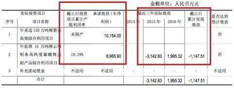 以鋰云母項目為例,在對深交所2016年年報問詢函的回復中顯示,此前為之募集的3億元資金,基本使用完畢,效果則如前文所述,遠沒有達到預期狀態(tài)。