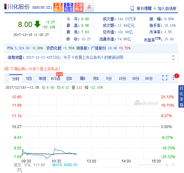 經(jīng)歷19個(gè)月的等待之后,*ST川化終獲準(zhǔn)重回A股,該股將于12月18日正式恢復(fù)上市,首個(gè)交易日的開盤參考價(jià)為10.27元/股。公司股票同日將撤銷股票交易退市風(fēng)險(xiǎn)警示,公司證券簡稱由“*ST川化”變更為“川化股份”。公司股票恢復(fù)上市首日不設(shè)漲跌幅限制,次一交易日起漲跌幅限制為10%。