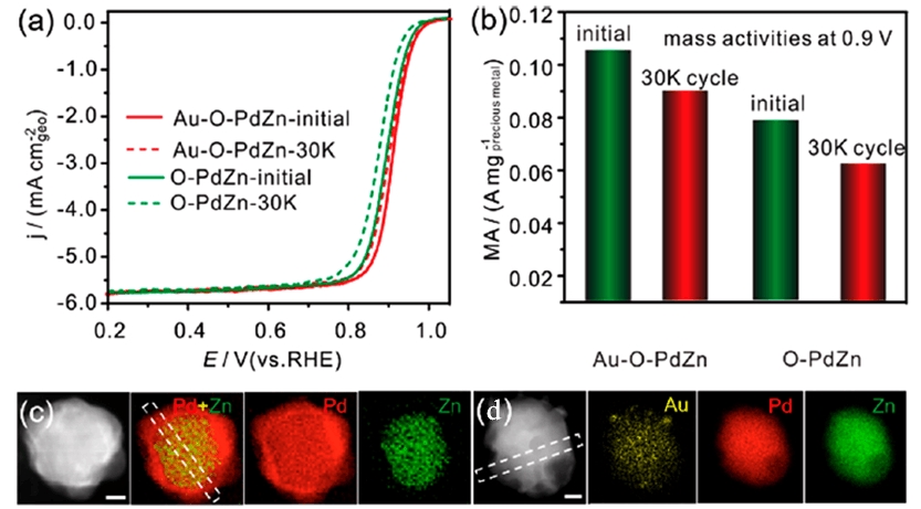圖1. Au修飾的O-PdZn有序金屬間化合物催化劑的性能評價(jià)與結(jié)構(gòu)分析