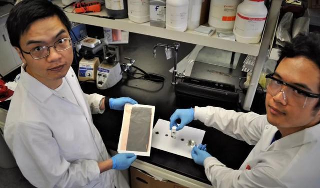 電池的石墨電極,陳驥(右)手中為新型正極材料、WiS水基電解液(來(lái)源:采訪對(duì)象提供)