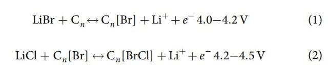 之后,電池放電過(guò)程中,石墨負(fù)極的碳層之間的金屬鋰釋放電子,變成鋰離子。同時(shí)電子也在放電過(guò)程中,通過(guò)外部電路從負(fù)極到達(dá)正極,溴、氯原子得到電子,分別變成溴離子和氯離子。此時(shí),water-in-salt電解質(zhì)阻擋住流動(dòng)的溴和氯離子移動(dòng),重新在正極內(nèi)生成固體鹽顆粒,直到下一輪充電。