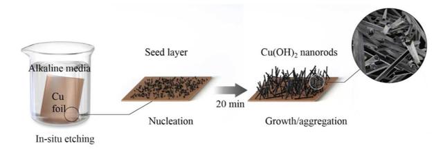 相比于金屬氧化物,金屬氫氧化物通常能夠提供更高的容量,因此近年來金屬氫氧化物的研究得到了較多的關(guān)注。Cu(OH)2納米棒的合成方法如下圖所示,首先采用去離子水配置2.5M NaOH和0.125M (NH4)2S2O8的混合溶液,銅箔在乙醇中清洗干凈后放入到該混合溶液處理20min,在該過程中發(fā)生的反應如下式所示,經(jīng)過20min的腐蝕,Cu箔表面生成了大量的Cu(OH)2納米棒,隨后銅箔經(jīng)過乙醇和去離子水清洗后進行常溫干燥。