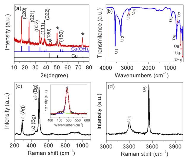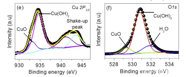 下圖a為處理后的Cu箔的XRD圖譜,從圖中能夠看到銅箔中主要存在Cu(OH)2和Cu兩種晶相。這一結(jié)果進一步被下圖b、c、d中所示的拉曼光譜數(shù)據(jù)所證實。比表面測試發(fā)現(xiàn)該材料的比表面積達到了6.661m2/g,平均孔尺寸為92.71nm。為了分析Cu箔表面的化學狀態(tài),作者進行了XPS分析,Cu 2p圖譜中在933.07eV和934.64eV存在兩個特征峰,分別對應CuO和Cu(OH)2,從O 1s圖譜中我們也進一步確認了這兩種物質(zhì)的存在。