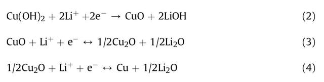 下圖b為Cu(OH)2納米棒的充放電曲線(電壓范圍為0.005-3.0V),從圖中能夠注意到在放電的過程中在1.57V、1.26V和0.9V附近出現(xiàn)了電壓平臺,其中在1.57V附近對應的為Cu(OH)2不可逆的分解為CuO(如下式2所示),1.26V電壓平臺對應的為CuO分解為Cu2O,0.9V附近的電壓平臺對應的則為Cu2O進一步分解為Cu。Cu(OH)2納米棒首次放電比容量達到2145mAh/g,但是在第二圈循環(huán)中放電容量就下降到了1569mAh/g,并最終穩(wěn)定在了1472mAh/g。但是在隨后的循環(huán)中充放電曲線則幾乎重合,這表明電極良好的可逆性和界面穩(wěn)定性。但是我們也注意到在后續(xù)的循環(huán)過程中,電池的充電容量總是高于放電容量,電池的庫倫效率也降低到了70%,作者認為這可能是因為材料的結(jié)構(gòu)變化,以及銅箔集流體在循環(huán)過程中的氧化等原因。