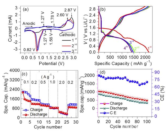下圖a為Cu(OH)2納米棒的循環(huán)伏安曲線,從下圖可以看到Cu(OH)2納米棒的首次充放電曲線與后續(xù)的兩次充放電曲線之間存在著明顯的區(qū)別,這可能是由于極化和生成SEI造成的。在還原掃描的過程中第一個還原峰出現(xiàn)在0.75V附近,對應的是Cu(OH)2的分解,其余的兩個還原峰分別出現(xiàn)在0.46V和0.31V、,對應的是電解液的分解,在氧化掃描的過程中氧化峰出現(xiàn)在0.77V、1.36V、1.97V,對應的是Cu再次被氧化成為Cu2O,最終氧化為CuO,整個充放電過程中的電化學反應如下式所示。
