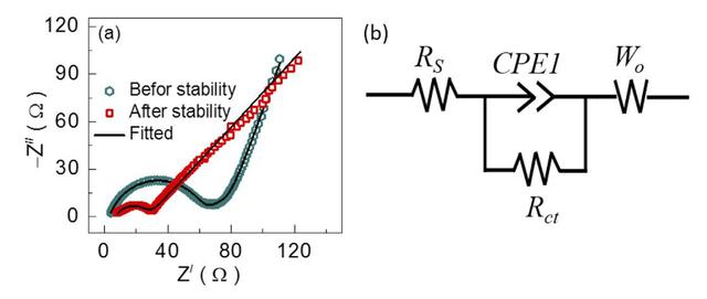 下圖為Cu(OH)2納米棒材料在循環(huán)前后的交流阻抗圖譜,作者根據(jù)下圖b中所示的等效電路對交流阻抗數(shù)據(jù)進行了擬合,擬合結(jié)果顯示循環(huán)前Cu(OH)2納米棒的電荷交換阻抗為56.75Ω,而循環(huán)后電荷交換阻抗降低到了21.05Ω,這可能是由于反復的循環(huán)過程中Cu(OH)2納米棒發(fā)生了顯著的結(jié)構(gòu)變化。