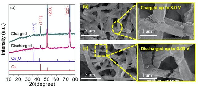 下圖b和c為Cu(OH)2納米棒在充放電后的表面形貌,從圖中能夠看到在充電狀態(tài)下Cu(OH)2納米棒發(fā)生了顯著的體積膨脹和團聚,表面狀態(tài)非常粗糙。在放電狀態(tài)下,Cu(OH)2納米棒體積收縮,但是仍然存在由于體積膨脹產(chǎn)生的結(jié)構(gòu)破壞,結(jié)構(gòu)破壞造成了部分活性物質(zhì)無法參與到充放電反應,從而造成了容量損失。