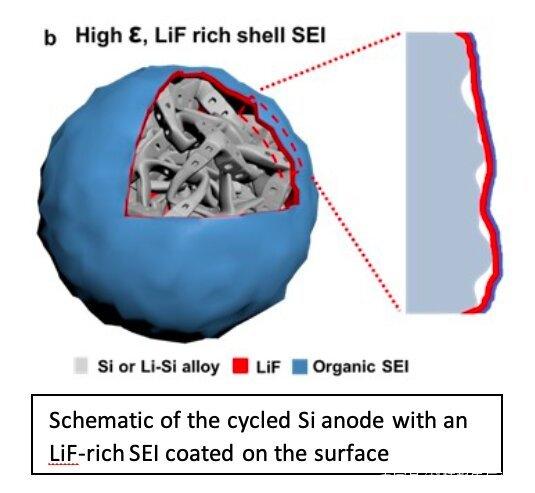 盡管硅陽極具有更高的容量,但迄今為止,硅陽極還無法與石墨陽極競(jìng)爭(zhēng),因?yàn)楣柙陔姵剡\(yùn)行過程中會(huì)膨脹和收縮,因此在電池工作時(shí),陽極的外層保護(hù)層很容易破裂。在最近發(fā)表在《Nature Energy》雜志上的一篇論文中,美國馬里蘭大學(xué)和陸軍研究實(shí)驗(yàn)室的研究人員提出了一種新的電解液設(shè)計(jì),可以克服現(xiàn)有硅陽極的局限性。