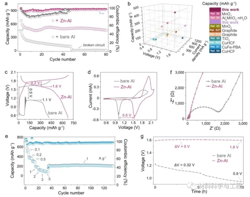 本文作者針對(duì)以上問題,利用MnO原位反應(yīng)成AlxMnO2作為正極,并提出通過簡單地電鍍,制備Al-Zn合金作為AAIB負(fù)極材料。該方法僅在Zn箔上通過簡單地電鍍制成,并且Al負(fù)極中Zn元素的加入可以有效地抑制鈍化和自放電反應(yīng),并大大提高庫倫效率(通過抑制與氫氣的副反應(yīng))。并且由于Al3+較Zn2+的電位更低,在充放電過程中Al3+會(huì)形成一個(gè)正電荷靜電“盾”,抑制金屬枝晶的生長。種種優(yōu)勢也電化學(xué)測試中得到體現(xiàn):所制備的AAIB放電電壓高達(dá)1.6V,并在100 mA h g-1的電流密度循環(huán)80圈后比容量達(dá)到空前的460 mA h g-1,是迄今為止所報(bào)道的放電電壓比容量和最高AAIB電池。