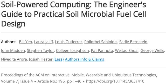 近日,相關(guān)論文以《土壤驅(qū)動(dòng)計(jì)算:工程師的實(shí)用土壤微生物燃料電池設(shè)計(jì)指南》(Soil-Powered Computing: The Engineer's Guide to Practical Soil Microbial Fuel Cell Design)為題發(fā)表在 Proceedings of the ACM on Interactive, Mobile, Wearable and Ubiquitous Technologies[1]。