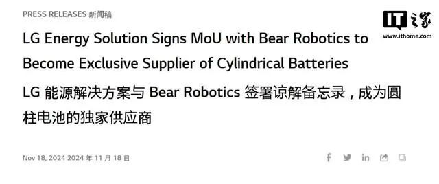 LG 新能源(LG Energy Solution)今天宣布,與硅谷公司 Bear Robotics 簽署了一份諒解備忘錄(MoU),成為其圓柱形電池單元的獨家供應商。兩家公司還將在技術創(chuàng)新方面展開合作。