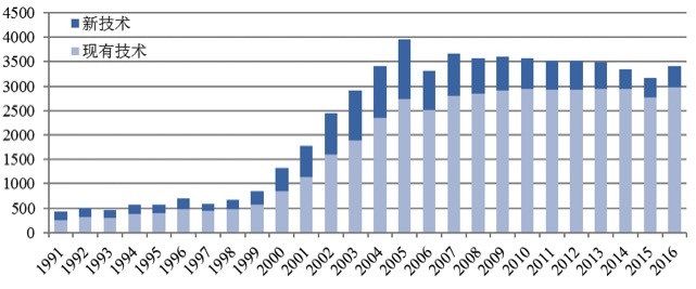 圖中將IPC分類號數(shù)量近似算作技術(shù)的數(shù)量,深藍色表示當年新出現(xiàn)的技術(shù),淺藍色表示當年之前已經(jīng)存在的技術(shù)。圖中顯示,燃料電池技術(shù)在1999年前后,新技術(shù)和已有技術(shù)同步快速增長,發(fā)展到2006年,隨著年度技術(shù)數(shù)量基本保持平穩(wěn),新技術(shù)的比例呈現(xiàn)下降趨勢,反映出行業(yè)技術(shù)趨于成熟。