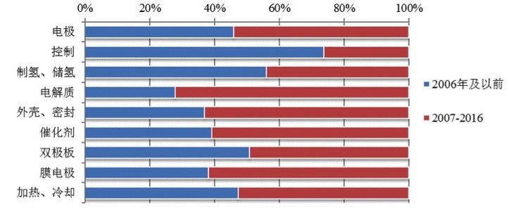 圖中可以看出,電解質(zhì)、外殼和密封、催化劑、膜電極組件等技術(shù)在最近幾年的發(fā)展速度超過平均發(fā)展速度。顯示這些技術(shù)為近期燃料電池領(lǐng)域技術(shù)研發(fā)熱點,得到研發(fā)機構(gòu)的追捧。