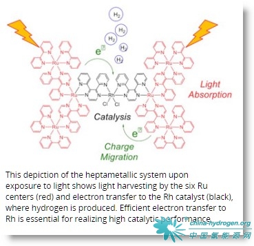研究人發(fā)現(xiàn),3個釕捕光中心和1個銠催化中心形成的4金屬系統(tǒng)在不停運轉(zhuǎn)4小時后,每個催化劑分子只生成40個氫分子,相比之下,6個釕捕光中心和1個銠催化中心形成的7金屬系統(tǒng)的效率可以提高7倍以上,它們成分組成相似,然而效率和穩(wěn)定性的差距非常大。