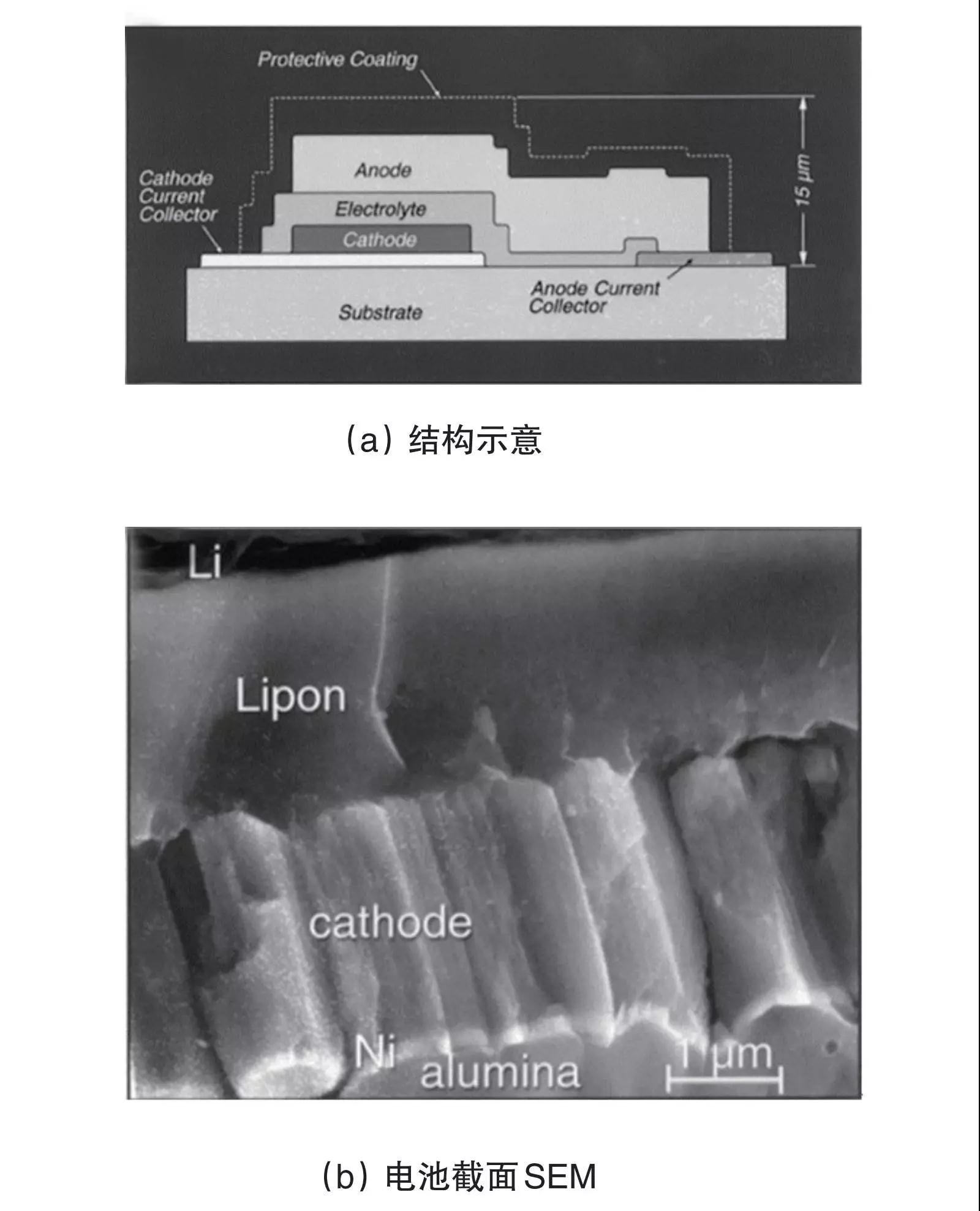 將電池的各組成部分通過適當(dāng)?shù)谋∧ぶ苽浼夹g(shù)(如氣相沉積、離子濺射、溶膠-凝膠、激光脈沖沉積等)制成薄膜,并按照電池結(jié)構(gòu)順序堆疊在基底之上,即可形成薄膜全固態(tài)電池 。采用工藝溫度較低的薄膜制備技術(shù),可在保證電極與電解質(zhì)接觸良好的情況下有效避免二者間發(fā)生反應(yīng)。薄膜全固態(tài)電池具有高的體積能量密度和質(zhì)量能量密度,可以廣泛用于便攜式移動設(shè)備、電動代步工具、醫(yī)療器械、航天及軍事工業(yè)。借助模板法、光刻技術(shù)、氣凝膠法、等離子刻蝕等技術(shù)將薄膜電池制成三維結(jié)構(gòu),可以進(jìn)一步提高電池的功率密度和單位面積能量密度 。