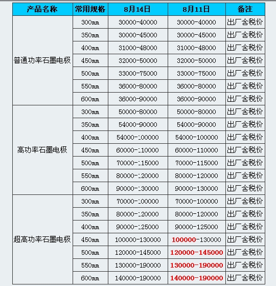 就在8月11日,方大炭素也將普通、高功和超高功率石墨電極價(jià)格上調(diào),其中Φ300mm-Φ800mm普通功率石墨電極報(bào)價(jià)10-萬(wàn)12萬(wàn)元/噸;Φ300mm-Φ700mm高功率石墨電極報(bào)價(jià)12萬(wàn)-15萬(wàn)元/噸;Φ550mm-Φ700mm超高功率石墨電極報(bào)價(jià)16.5萬(wàn)-19萬(wàn)元/噸。按照百川資訊的說(shuō)法,該企業(yè)銷售較好,庫(kù)存低位。部分產(chǎn)品出口美國(guó)、俄羅斯聯(lián)邦、德國(guó)和阿曼等國(guó)家。企業(yè)年產(chǎn)能12萬(wàn)噸,7月份產(chǎn)量9000噸,普通15%,高功30%,超高55%。