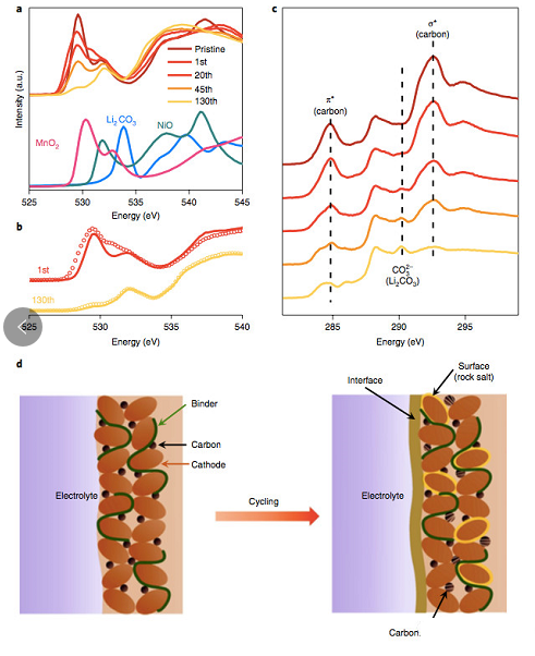 通過對上述的XAS數(shù)據(jù)半定量分析,EnyuanHu得到了在1、2、25、46和83次循環(huán)時富鋰材料中不同元素對材料整體容量的貢獻(xiàn)(如下圖a所示),從圖中可以看到在首次循環(huán)時氧和鎳供應(yīng)了主要容量,分別達(dá)到128mAh/g和94mAh/g。但是隨著循環(huán)的進(jìn)行,氧和鎳元素提供的容量迅速減少,在83次循環(huán)時,氧元素提供的容量僅為50mAh/g,鎳元素提供的容量也下降到了66mAh/g。但是錳和鈷元素貢獻(xiàn)的容量卻隨著循環(huán)次數(shù)的增加而增加,例如第一次放電時錳、鈷提供的容量分別14mAh/g和26mAh/g,但是隨著循環(huán)到83次時,兩者的容量分別增加到了66mAh/g和53mAh/g。