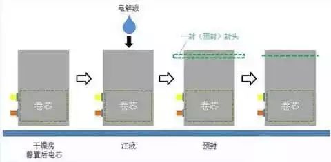 注液、預(yù)封工序,軟包電芯在頂側(cè)封之后,需要做X-ray檢查其卷芯的平行度,然后就進(jìn)干燥房除水氣去了。在干燥房靜置若干時(shí)間時(shí)候,就進(jìn)入了注液與預(yù)封工序。