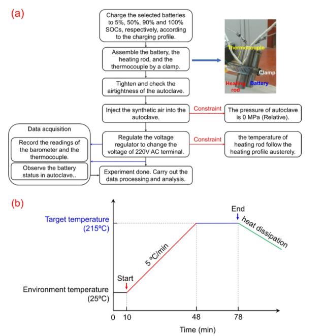 試驗流程如下圖所示,首先將電池的SoC狀態(tài)調整到5%、50%、90%和100%SoC,然后將電池、熱電偶和加熱電阻組合在一起,將電池裝入到裝置中后,向其中充入人造空氣(O2:N2=2.1:7.9),然后按照下圖b所示的加熱制度為鋰離子電池進行加熱。