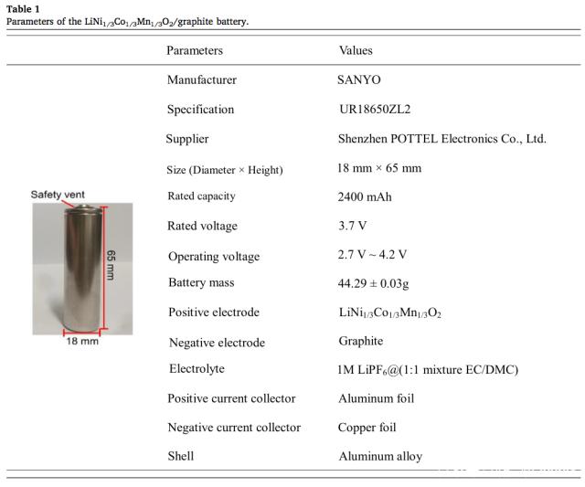 試驗中采用的鋰離子電池為18650電池,電池的基本信息如上表所示,電池的正極為NCM111材料,負極為石墨材料,額定容量2400mAh,分別測試該電池在5%、50%、90%和100%SoC狀態(tài)下的熱穩(wěn)定性。