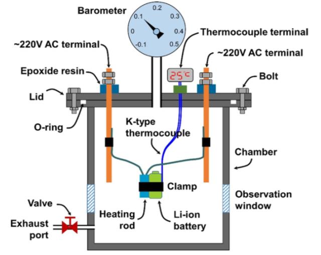 試驗中采用的測試裝置如下圖所示,密封容器的總體積為24L,主要由不銹鋼外殼、觀察窗、溫度傳感器、加熱裝置等部分構成。