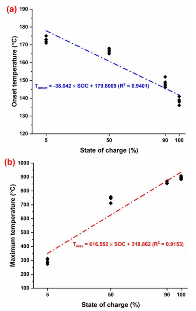 在下圖中作者對不同SoC電池在熱濫用測試中的熱失控起始溫度和最高溫度進行了線性擬合,從擬合結果可以看到隨著電池SoC的升高,電池熱失控的起始溫度出現了線性的降低,熱失控中達到了最高溫度則隨著SoC的升高而增加,表明較高的SoC會導致鋰離子電池的熱穩(wěn)定性顯著降低。