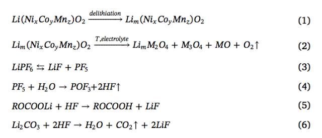 通過XRD分析可以發(fā)現,這些顆粒主要成分除了C外,還有鋰/過渡金屬元素的氧化物LixM2O4(M=Co、Ni、Mn),以及過渡金屬氧化物MmOn(M=Co、Ni、Mn),表明這些顆粒中有相當一部分為正極材料的分解產物,試驗數據顯示在熱失控中電池的最高溫度達到了850℃以上,研究表明在這一溫度下,NCM111材料會被分解為無序LixM2O4和M3O4尖晶石結構產物,以及MO巖鹽結構相產物(反應如下式1和2所示)。從下圖b中能夠看到LiF數量也比較多,LiF主要來自于LiPF6在高溫下的分解(反應如下式3-6所示)。