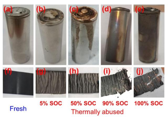 下圖為新電池和不同SoC狀態(tài)熱濫用后電池的外觀,從圖中能夠看到所有的電池都是從防爆閥泄壓,殼體并未被破壞。對于5%和50%SoC的電池能夠從上蓋處觀察到電解液泄漏的痕跡,而90%和100%SoC的電池則在上蓋處觀察到了燃燒的痕跡。對熱濫用測試后的電池進行解剖后發(fā)現,5%和50%SoC的電池的活性物質仍然牢固的粘結在集流體上,隔膜出現了嚴重的收縮,但是沒有被完全燒毀。而對于90%和100%SoC的電池在熱濫用后電極則完全被破壞,活性物質從集流體表面剝落,隔膜也被完全燒毀。