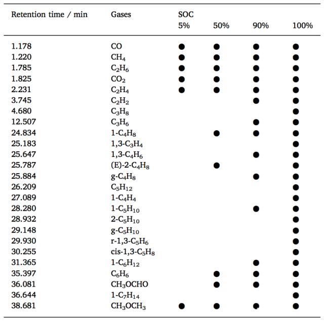 下表為在電池發(fā)生熱失控過程中產生的氣體的成分,從圖中能夠看到隨著電池SoC的升高,電池產生的氣體的種類也在增多,5%、50%、90%和100%SoC的電池在這一過程中產生的氣體種類分別為6、10、15和25種。