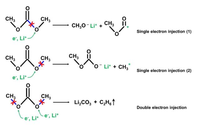 下圖為100%SoC的電池在熱失控中產生的氣體成分,從圖中能夠看到主要的氣體成分為CO、碳氫化合物、酯類和醚類,這些氣體成分主要來自于電解液溶劑在高溫下的分解反應。其中DMC溶劑在高溫下與Li+的反應如下式所示,形成CH3*和CH3OCO*自由基,以及C2H6等產物,同時CH3*在高溫下還會分解產生CH2*和H*,從而進一步反應生成多種復雜的產物,例如CH4和C2H2,CH3OCHO等。