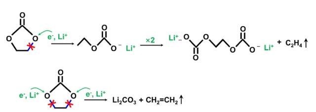 EC溶劑與Li+在高溫下的反應如下式所示,產生C2H4和Li2CO3等產物。