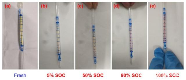由于傳統(tǒng)的氣質聯用設備無法探測HF氣體,因此作者采用No. 17L GASTEC試紙對電池在熱失控中產生的氣體中的HF的含量進行了檢測,從下圖的檢測結果可以看到,在較高的SoC狀態(tài)下熱失控電池產生的氣體中含有數量更多的HF成分(試紙的紅色更深)。