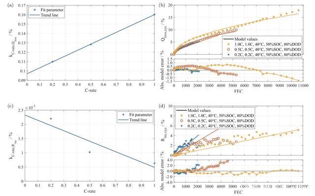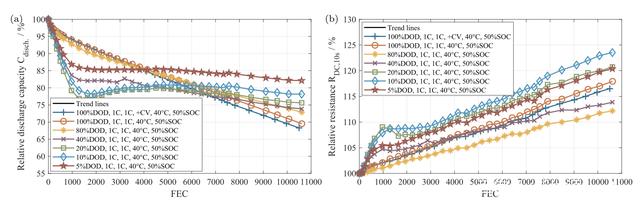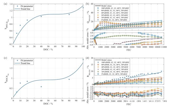 Maik Naumann通過對大量的磷酸鐵鋰電池進行測試,發(fā)現(xiàn)放電深度和SoC范圍對于磷酸鐵鋰電池的容量衰降和內(nèi)阻增加有重要的影響,基于測試數(shù)據(jù)作者進行了建模,模型很好地模擬了磷酸鐵鋰電池的容量衰降(小于1%)和內(nèi)阻增加(誤差小于2%)。