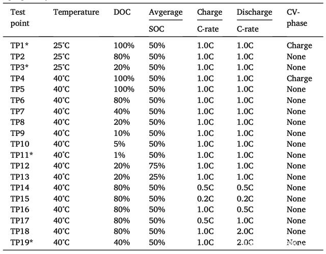 實驗中作者共計安排了19個實驗點(如下表所示),分別測試了不同溫度、不同放電深度、不同SoC范圍,以及不同充放電電流對電池循環(huán)壽命的影響。