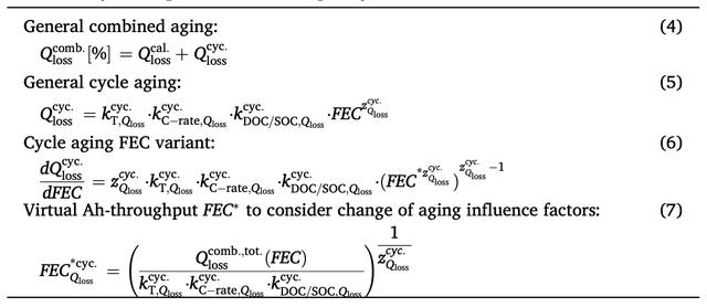 磷酸鐵鋰電池在循環(huán)過程中的衰降來自循環(huán)衰降和日歷存儲衰降兩種影響因素,因此作者將兩種影響因素整合到一個模型之中,對磷酸鐵鋰電池的衰降進行擬合。