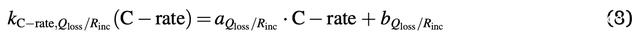 為了能夠?qū)⒈堵蕦τ诹姿徼F電池容量衰降和內(nèi)阻增加的影響單獨分離出來,作者將放電深度對容量衰降的影響因子KDOC Qloss設(shè)置為1,通過對上式5進行擬合,可以獲得倍率的影響因子KC-rate Qloss/Rinc,擬合結(jié)果如下圖a和c所示,從下圖a可以看到KC-rate Qloss與倍率之間呈現(xiàn)線性關(guān)系,因此我們可以將KC-rate Qloss轉(zhuǎn)化為下式8所示的形式,并計算得到其中的a和b的數(shù)值。根據(jù)KC-rate Qloss的數(shù)值作者對容量衰降進行了擬合(擬合結(jié)果如下圖b所示),從圖中能夠看到擬合結(jié)果與測試結(jié)果復(fù)合的非常好,0.2C和0.5C倍率下的擬合結(jié)果與實驗結(jié)果誤差小于0.5%,在1C倍率下壽命末期的擬合誤差也小于1.5%。